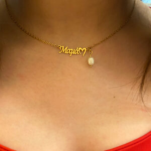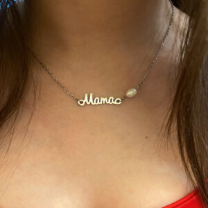 Το σχέδιό του είναι μοναδικό, καθώς το μισό αποτελείται από ατσάλινη αλυσίδα ενώ το μπροστινό μέρος στολίζεται με μαργαριτάρι, χάντρες από όνυχα και χρυσά ατσάλινα στοιχεία. Το κολιέ αυτό συνδυάζει την εκλεπτυσμένη κομψότητα του μαργαριταριού με την ενέργεια του όνυχα.