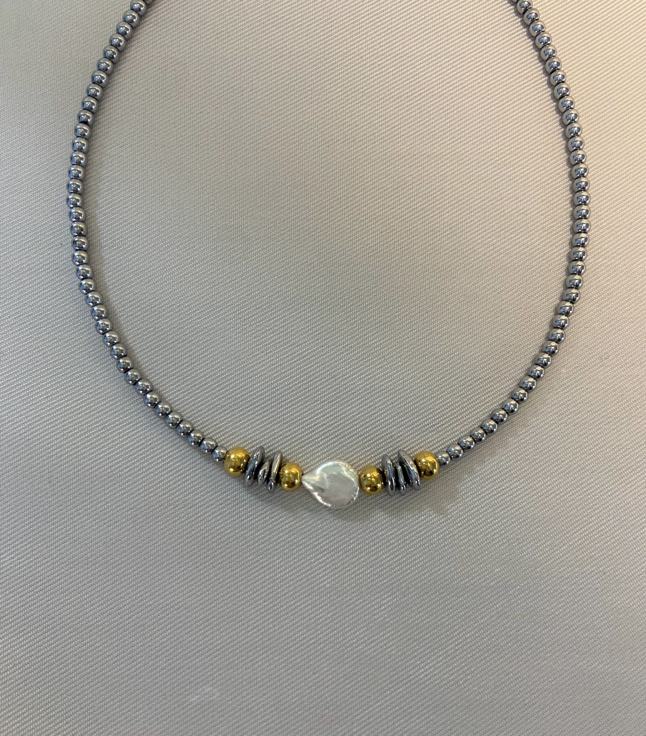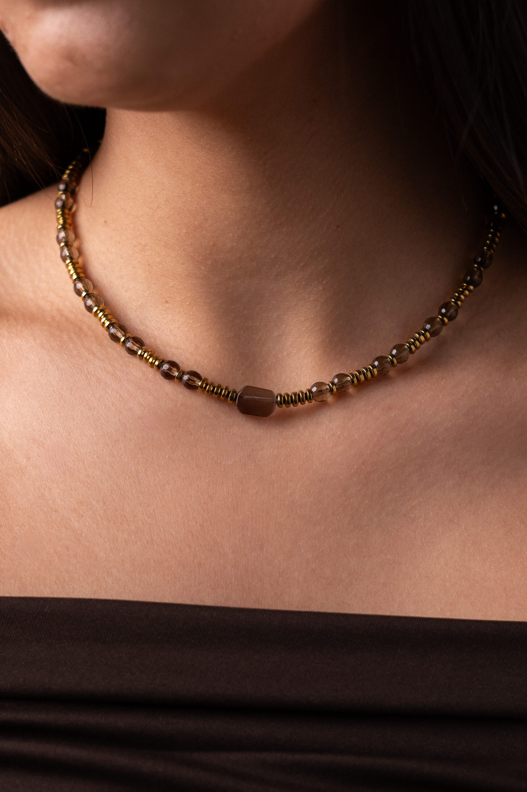 Οι φυσικές χάντρες καπνιστού χαλαζία είναι γνωστές για την γήινη ενέργεια τους και την διακριτική τους λάμψη, Συνδυασμένο με χρυσές χάντρες αιματίτη δημιουργούν ένα κομψό κόσμημα