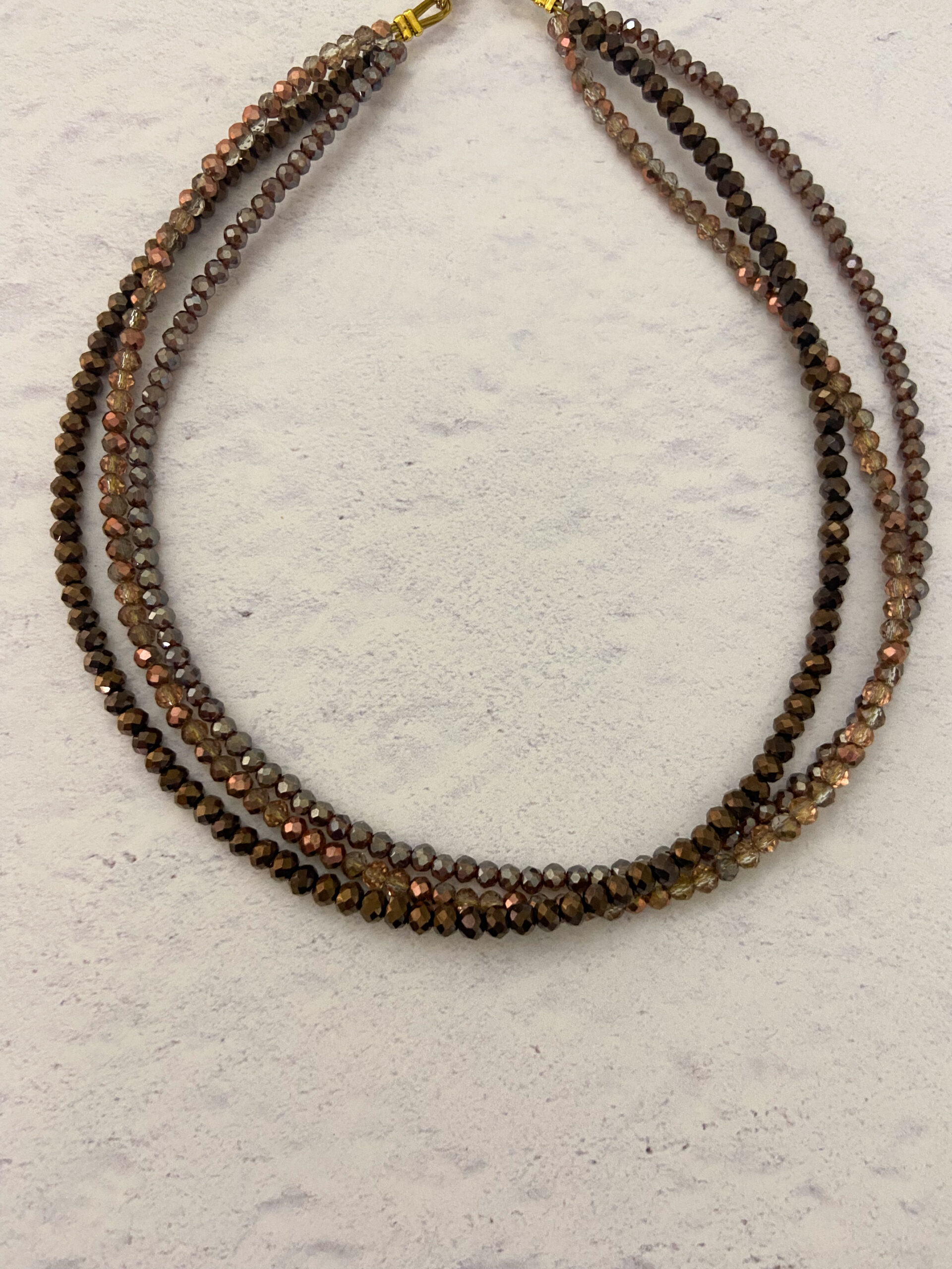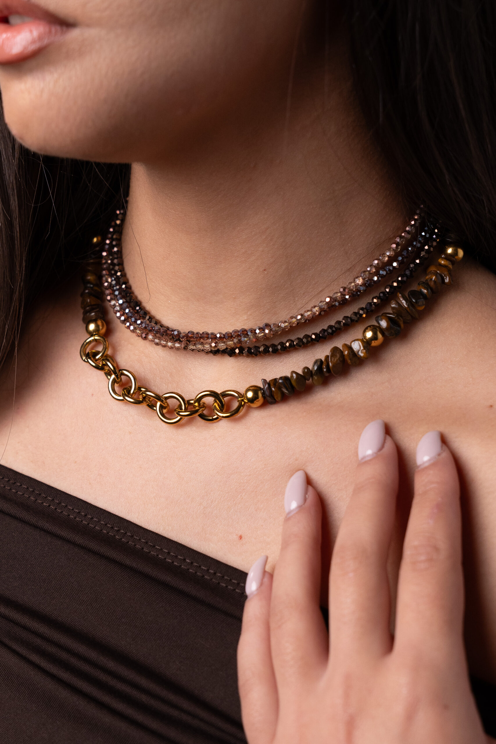 Ένα κομψό τριπλό κολιέ σε ζεστή καφέ απόχρωση με τρία λαμπερά κρυσταλλάκια διαφορετικών χρωμάτων. Ιδανικό για layering σε καθημερινό η βραδινό looks