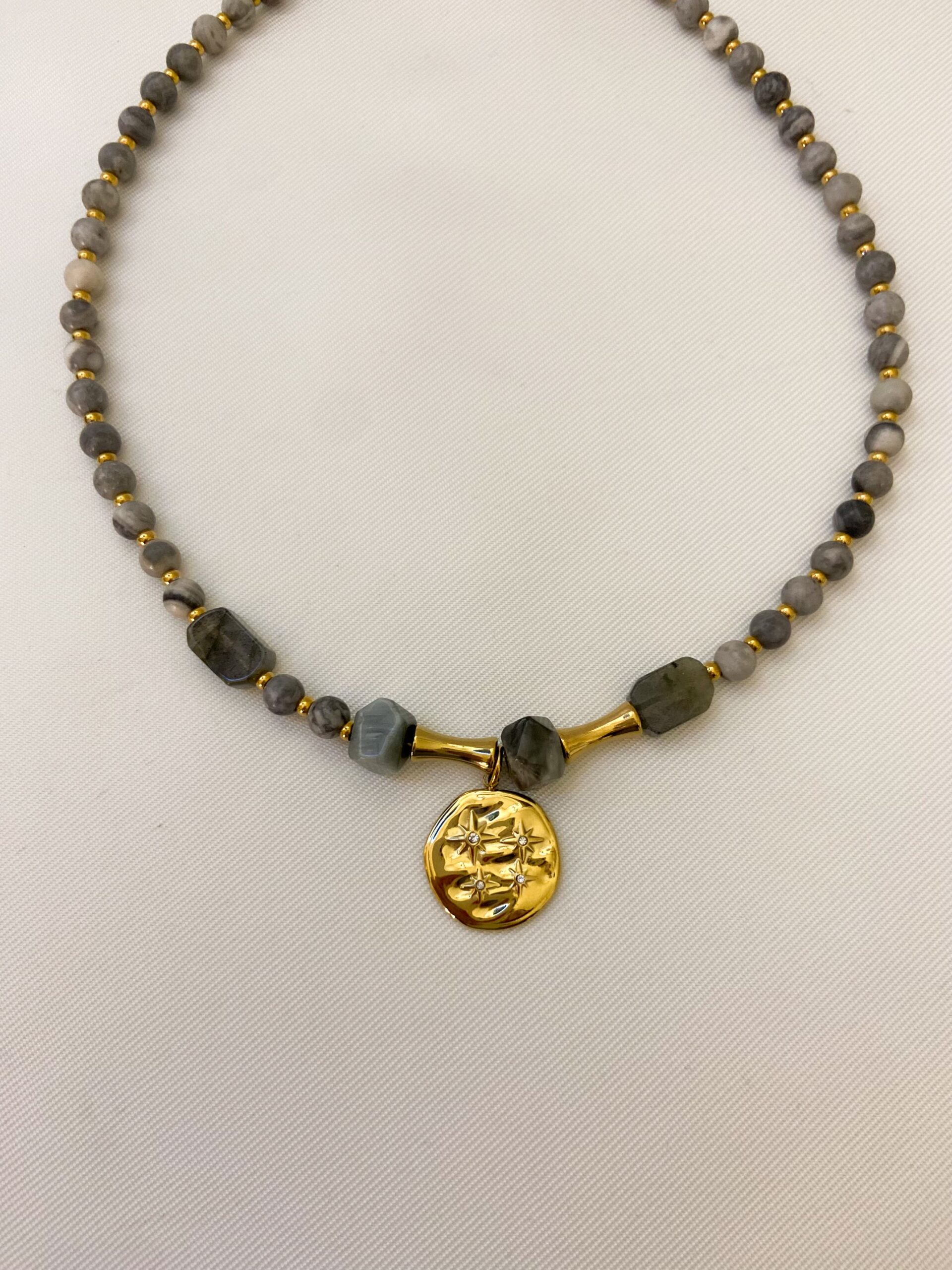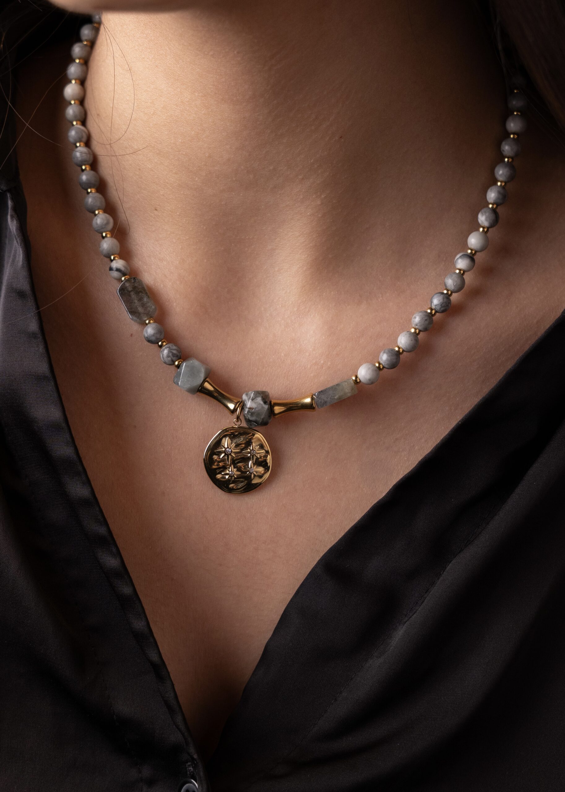 Ένα κολιέ που οι γκρι ημιπολύτιμες χάντρες δένουν αρμονικά με το ατσάλινο στοιχείο στο κέντρο, δημιουργώντας ένα καλλιτεχνικό κόσμημα. Ιδανικό αν αγαπάς το boho-chic στυλ με μία πινελιά πολυτέλειας
