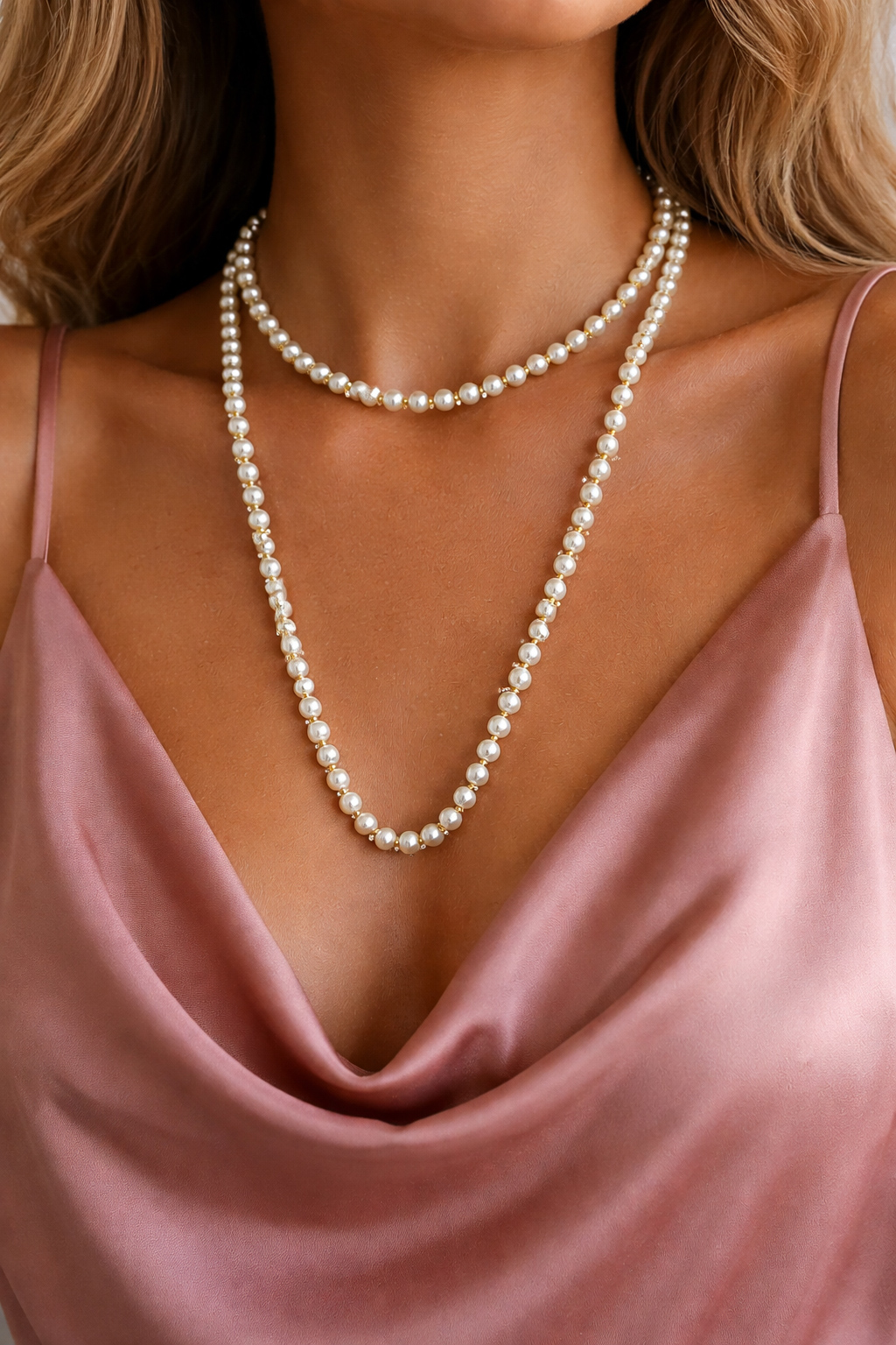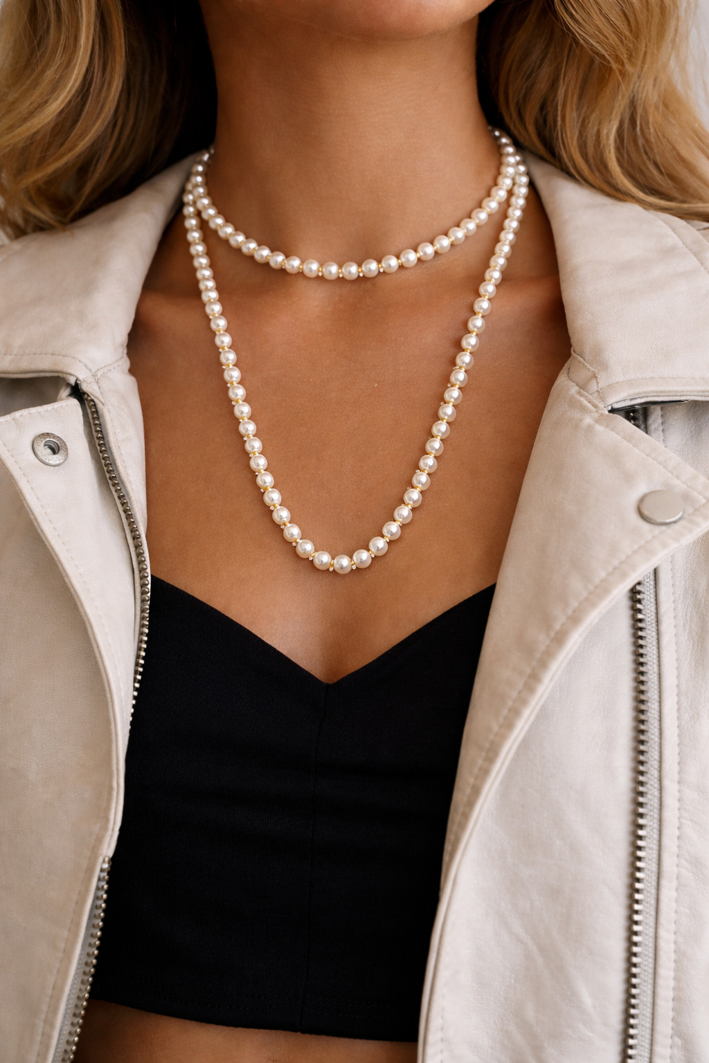 Ένα κολιέ με γυάλινες πέρλες που χαρίζει κομψότητα.