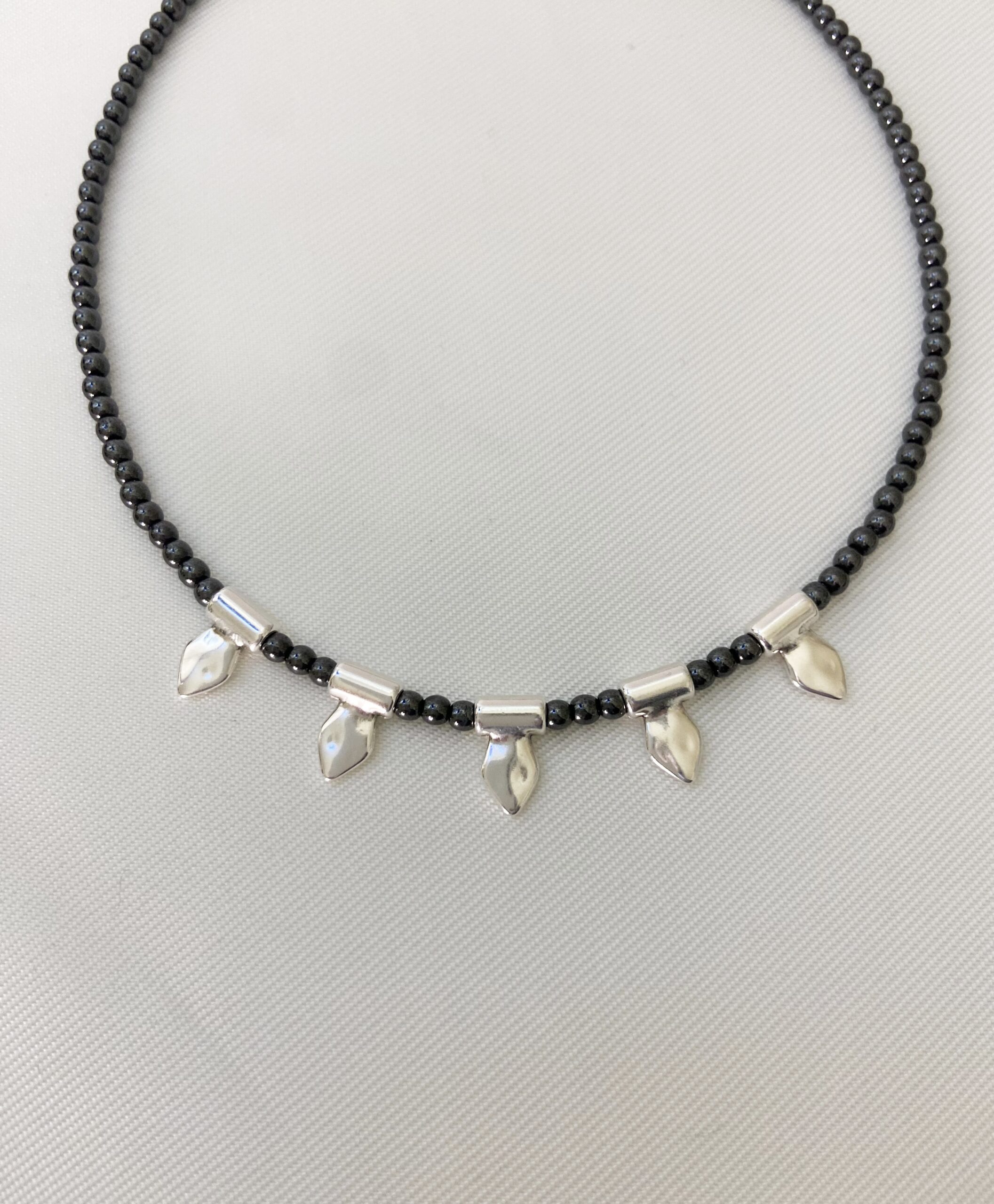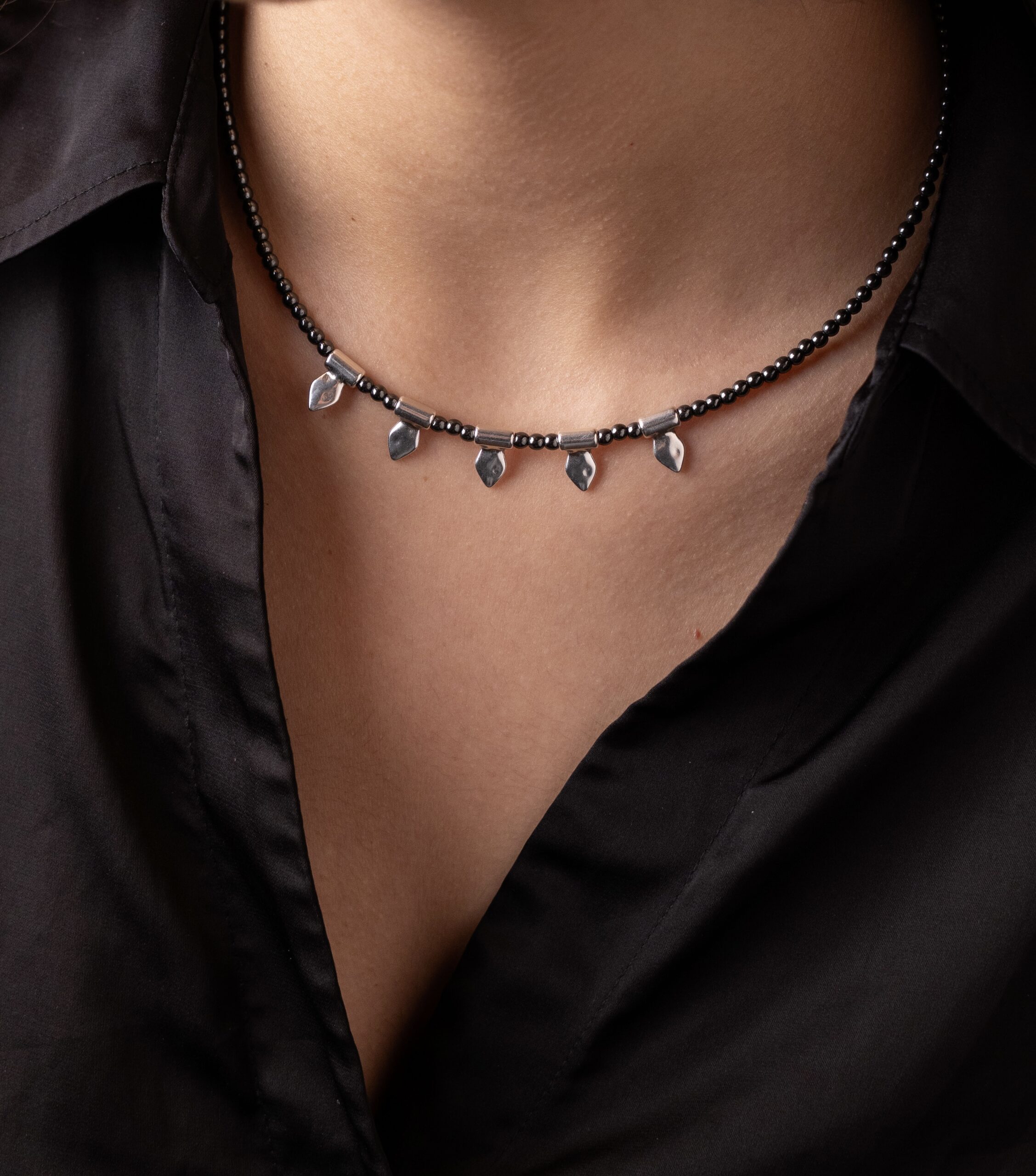 Ένα κολιέ που συνδυάζει χάντρες με αιματίτη και ασημένια στοιχεία σε σχήμα φύλλου. Είναι ιδανικό για όσες θέλουν ένα κόσμημα που ξεχωρίζει χωρίς να γίνεται υπερβολικό.